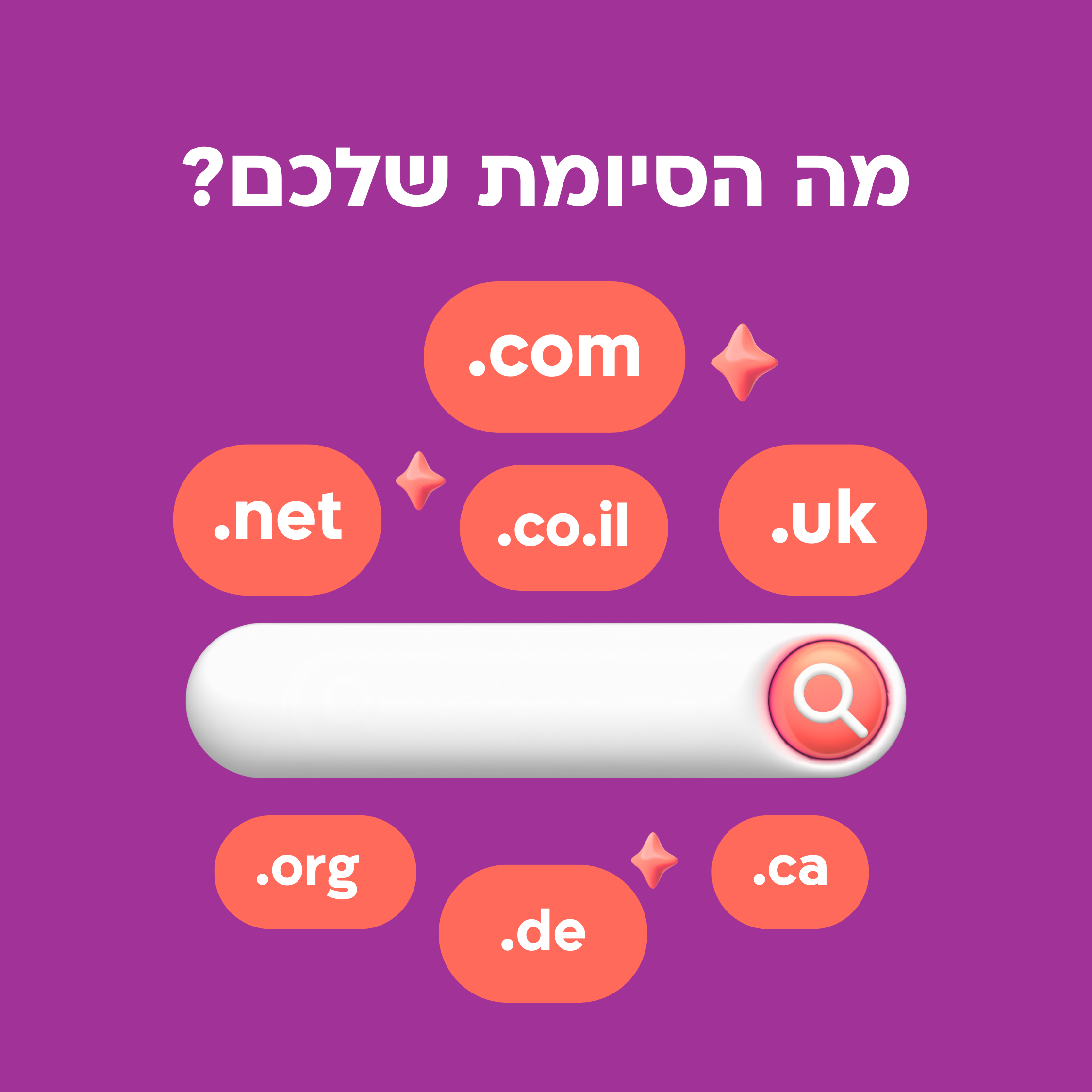 כאן תוכלו לבצע בדיקת זמינות דומיין, לבחור שם דומיין, להשוות בין סיומות דומיין שונות ולרשום את הדומיין שמתאים בדיוק לעסק שלכם — בישראל ובעולם.